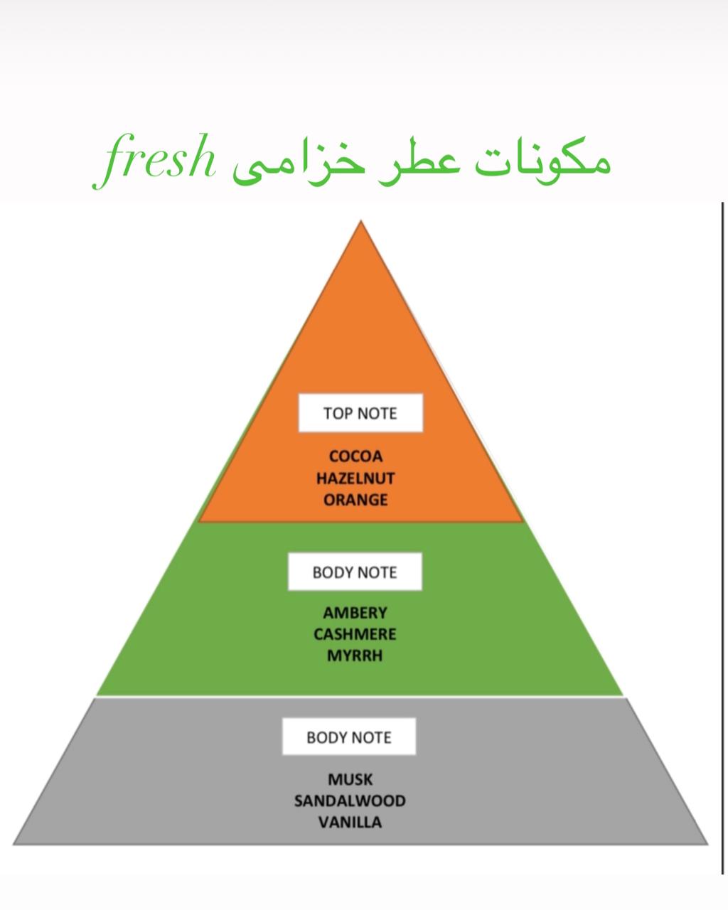 يفتتح العطر بنفحات مغرية من الكاكاو، والبندق، والبرتقال، تليها طبقة دافئة من العنبر، والكشمير، والمر، وتستقر القاعدة على المسك، وخشب الصندل، والفانيلا لتمنحك ثباتًا وإحساسًا بالفخامة.